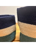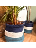 Featuring a striking striped design in blue, white, and teal, these baskets draw inspiration from the ancient Evil Eye symbol, known for its ability to ward off negative energy and protection to your home. Whether used to organize everyday items, store plants, or enhance your décor, these baskets complement bohemian, Mediterranean, and contemporary interior styles.